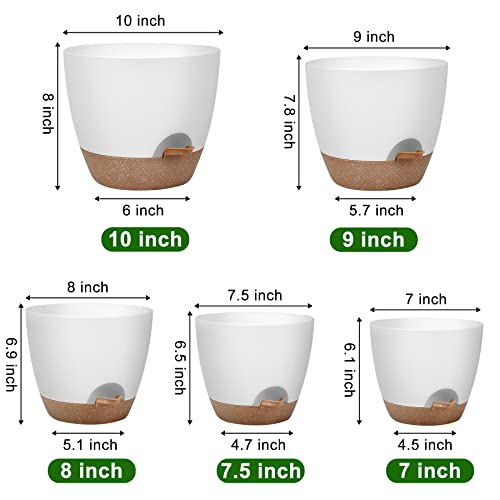Plant Pots 10/9/8/7.5/7 Inch Self Watering Pots, Set of 5 Plastic Planters with Drainage Holes and Saucers,Plastic Flower Pots,Nursery Planting Pot for Indoor Out Door Plants(White)