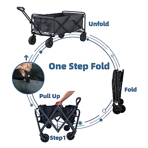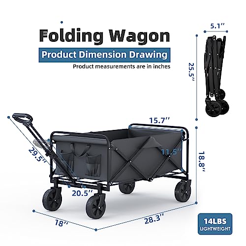 【One Step Fold Collapsible Wagon】The One step folding wagon cart is to be folded up by simply lifting the middle strap. Easy to operate, saves time and space.Overall Dimensions: 27.9” x18.9” x16.5”. Light Weighing only 14 pounds. Folding size:5.1” x 18.5”x 25.5”.
