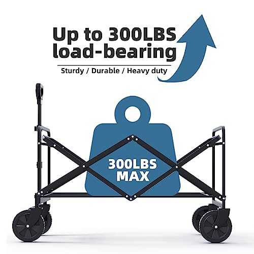 Collapsible Foldable Beach Wagon Carts with 360° Rotating Wheels for All Terrain, Utility Heavy Duty Folding Wagon with 300LBS Capacity for Grocery, Sand, Garden, Outdoor, Camping (Black)