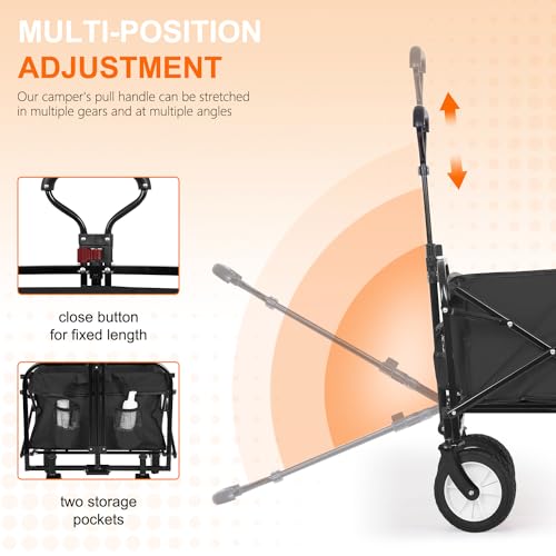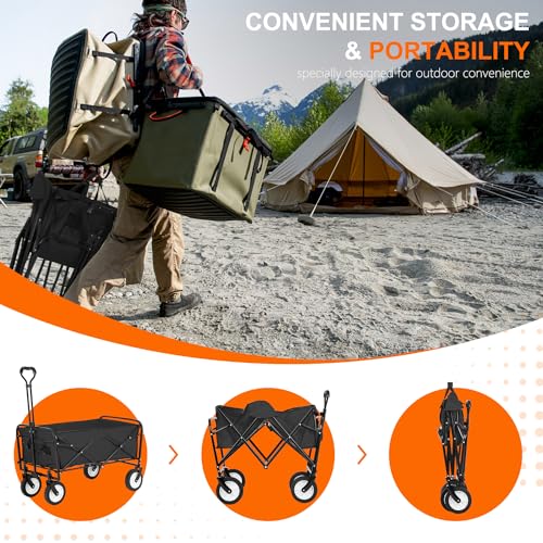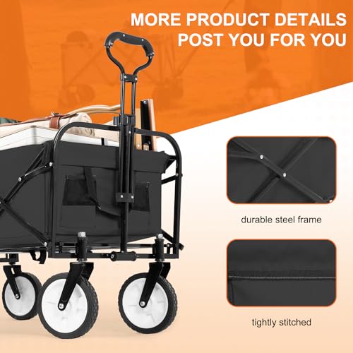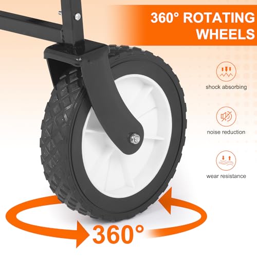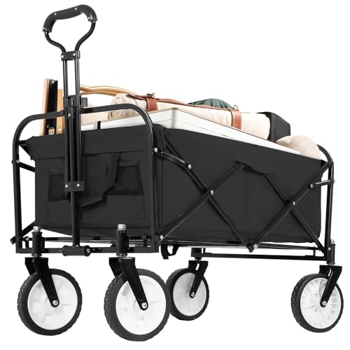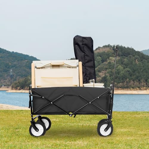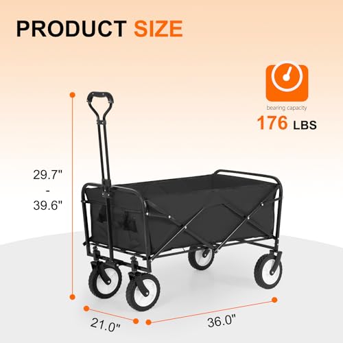 ๐360ยฐUniversal Wheels:This collapsible wagon utility cart equipped with four 6.5″ diameter all-terrain wheels, including two front wheels that can rotate 360 degrees.Our folding collapsible wagon can roll on different ground, from cement to wood floor, from stone road to sand.