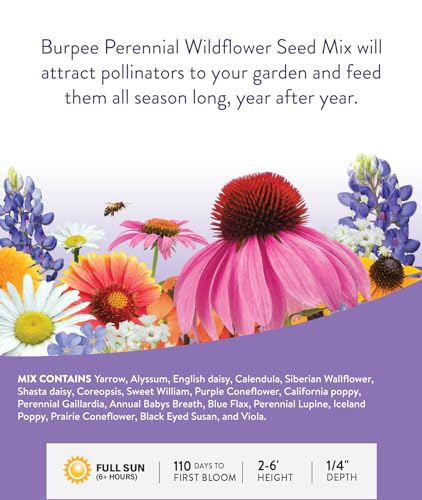 Grow a sun-loving mix of beautiful perennial wildflowers! Burpee’s perennial wildflower seeds mix includes a diversity of flowering plants that produce pollen and nectar for bees, butterflies and other helpful home garden visitors. The different colors, scents, flower forms and bloom times will attract pollinators to your garden and feed them all season long from early spring to fall, year after year! Each bag contains 18 flower varieties and at least 50,000 flower seeds: Yarrow, Alyssum, English daisy, Calendula, Siberian Wallflower, Shasta daisy, Coreopsis, Sweet William, Purple Coneflower, California poppy, Perennial Gaillardia, Annual Baby’s Breath, Blue Flax, Perennial Lupine, Iceland Poppy, Prairie Coneflower, Black Eyed Susan and Viola. 100% GUARANTEED: Burpee offers the highest quality, non-GMO seeds hand-picked by expert horticulturalists for growing in the home garden. Our germination rates are 35% higher than industry standards.We are committed to the satisfaction and success of all gardeners. If you are unsatisfied with your purchase, we aim to make it right!