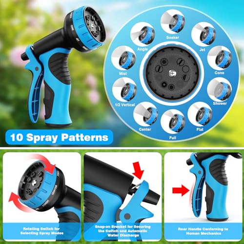 10 Spray Modes — This spray nozzle features a non-slip, comfortable grip and a rotating bezel for switching between 10 different spray modes. It is easy to operate and won’t strain your hand. With this flexible water hose, you can easily tackle a variety of watering and cleaning tasks, such as watering crops and flowers during different stages of growth, bathing pets, cleaning cars, floors, swimming pools, windows, and more. The 3/4-inch leak-proof connector is suitable for US garden faucets.