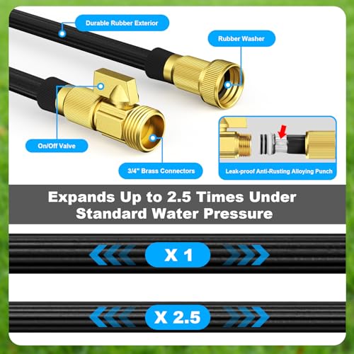 Expandable Garden Hose 2.5 Times — This flexible hose can expand to 100 feet within seconds after turning on the water pressure and quickly shrink back to a compact size for storage upon turning off the water pressure. Note: The garden hose has high elasticity, so please lay it flat on the ground and keep away from the hose nozzle when closing the water supply. When not in use, drain the water from the hose and store it in a cool, dry place.