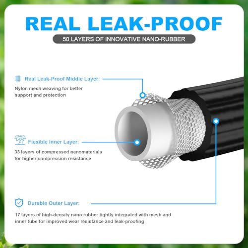 Innovative Quality Materials — The inner layer of the expandable garden hose is made of high-density natural rubber polyester woven fiber yarn, making it more elastic and resistant to deformation. Its outer layer is made of a nano-material that is abrasion-resistant, and aging-resistant, allowing for easy cleaning and quick drying. It effectively prevents damage and leakage. It also prevents dirt and sand from entering the inner tube, thereby enhancing its durability and lifespan.