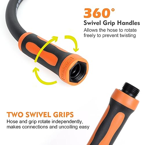 TWO SWIVEL GRIPS – Hose and grip rotate independently, makes connections and uncoiling easy, The movable handle allows the hose to rotate freely to prevent twisting.